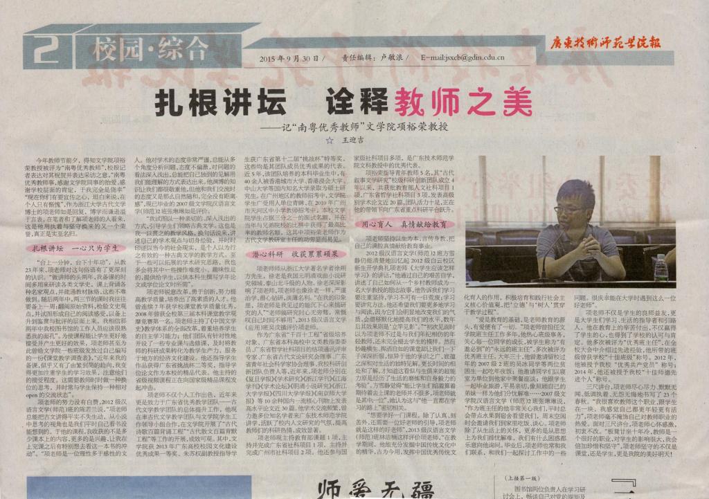 上一条:校报报道:许竹君、项裕荣教授获“南粤优秀教师”荣誉称号